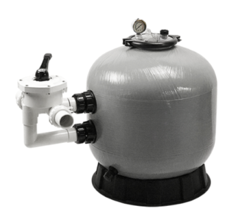 Pool water enters through an inlet pipe into the filter tank. Contaminants are trapped as the water flows through the filter media (or material). The clean water exits through an outlet pipe at the bottom of the filter tank.